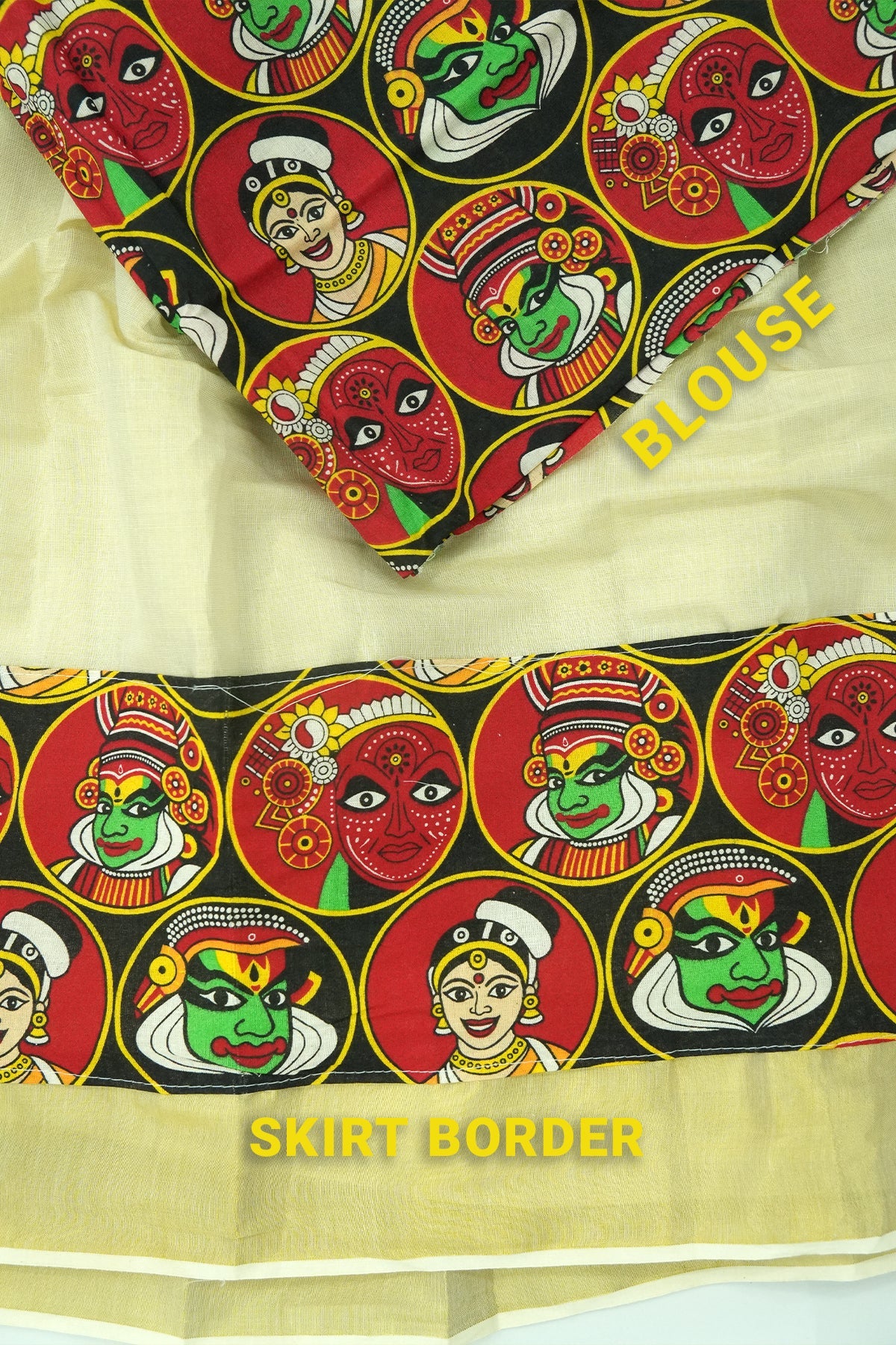 🎭 Top (Dhavani): Red & Black base with combined print of Theyyam, Kathakali & Thiruvathira