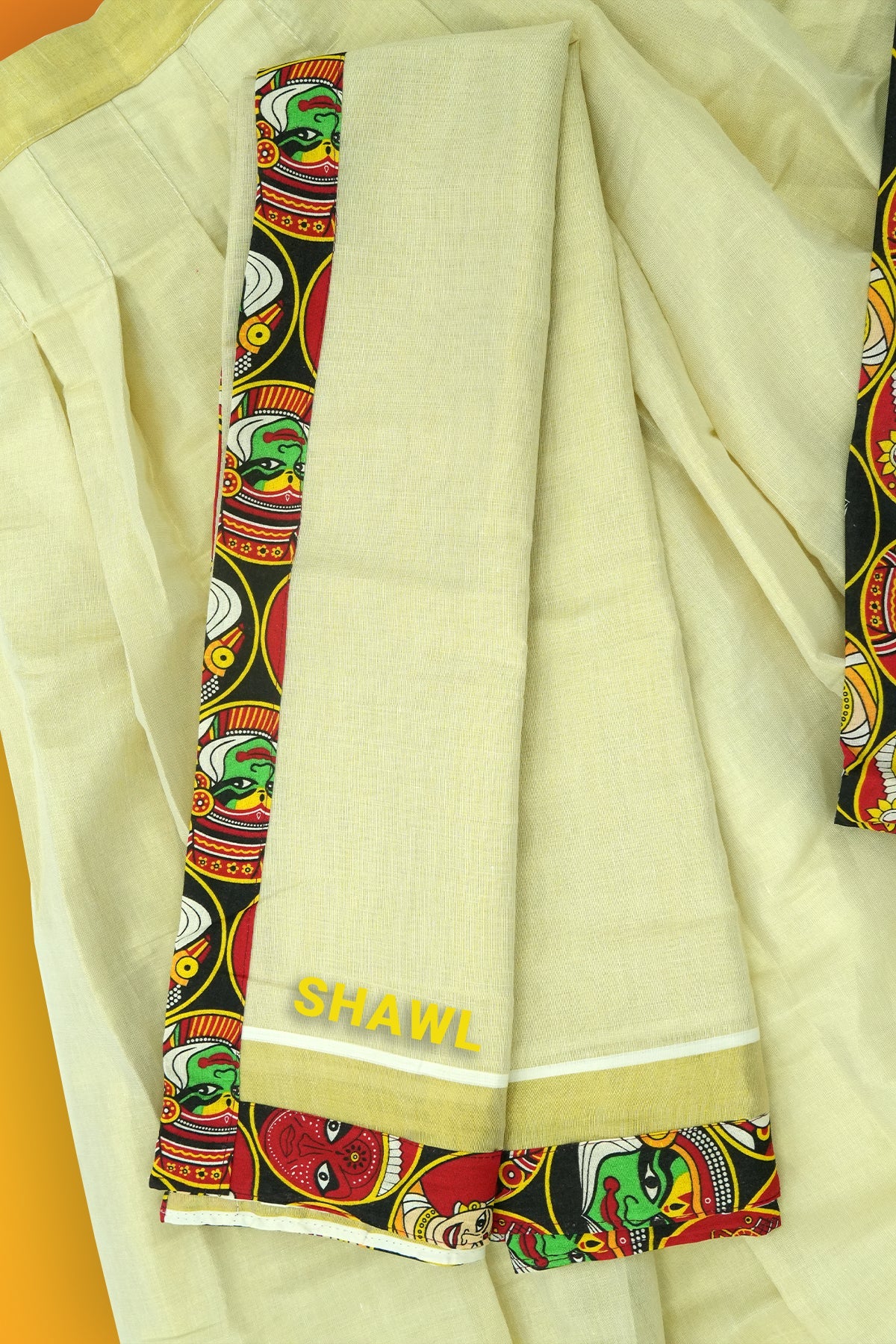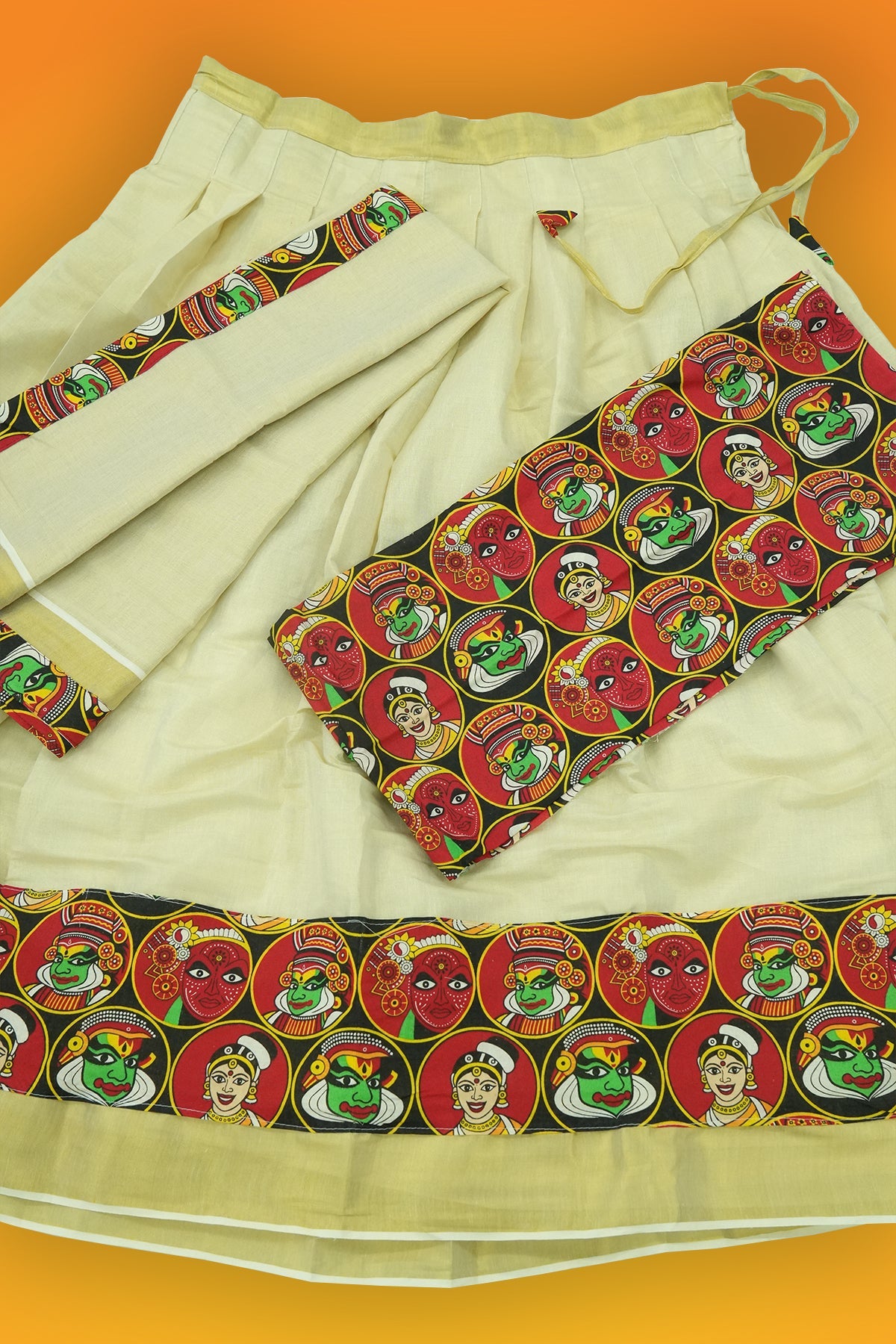 Celebrate Kerala’s timeless artistry with this elegant dhavani set that unites the soul of Theyyam, Kathakali, and Thiruvathira in one vibrant print. Perfectly paired with a traditional kasavu pavadai enhanced with designer panels, and a matching printed davani, this ensemble brings the power of cultural pride into festive fashion.