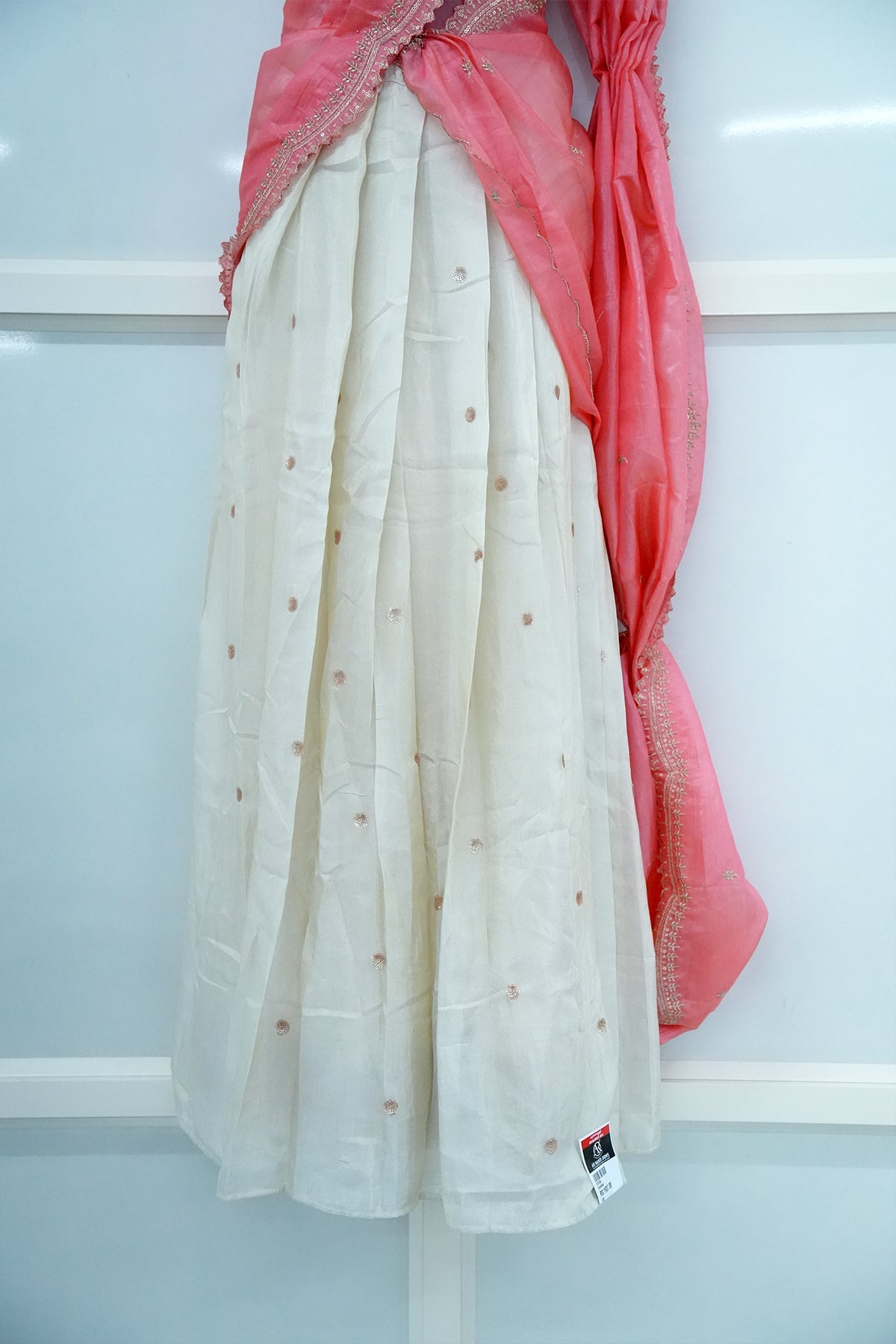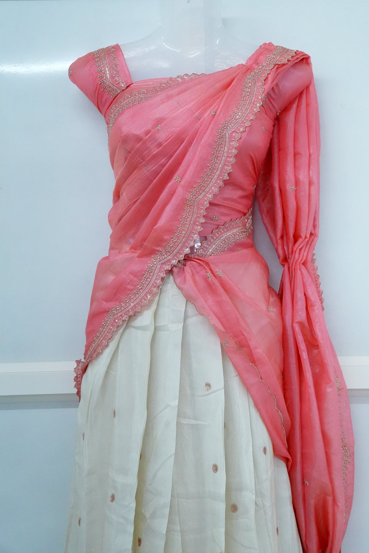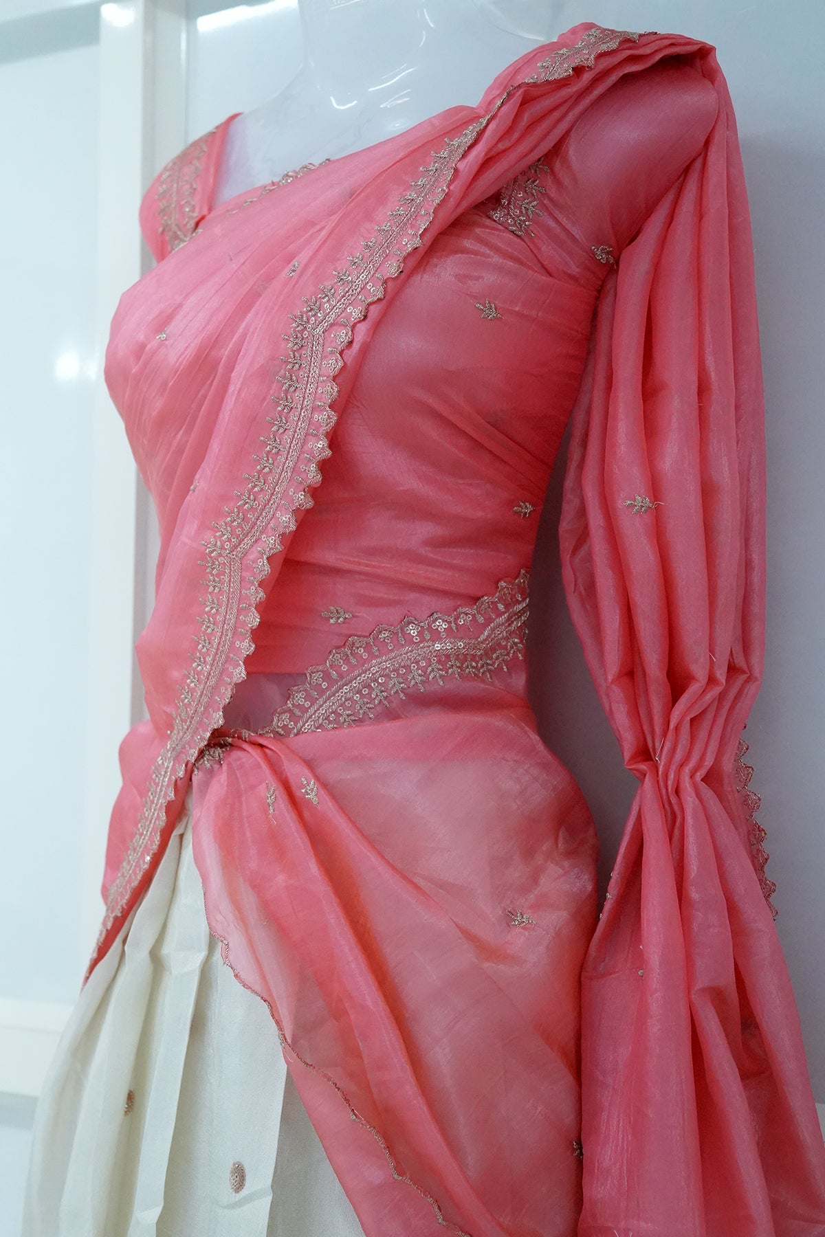 Add a touch of warmth and sophistication to your wardrobe with this delightful coral Dhavani set — a perfect blend of modern shimmer and traditional grace.