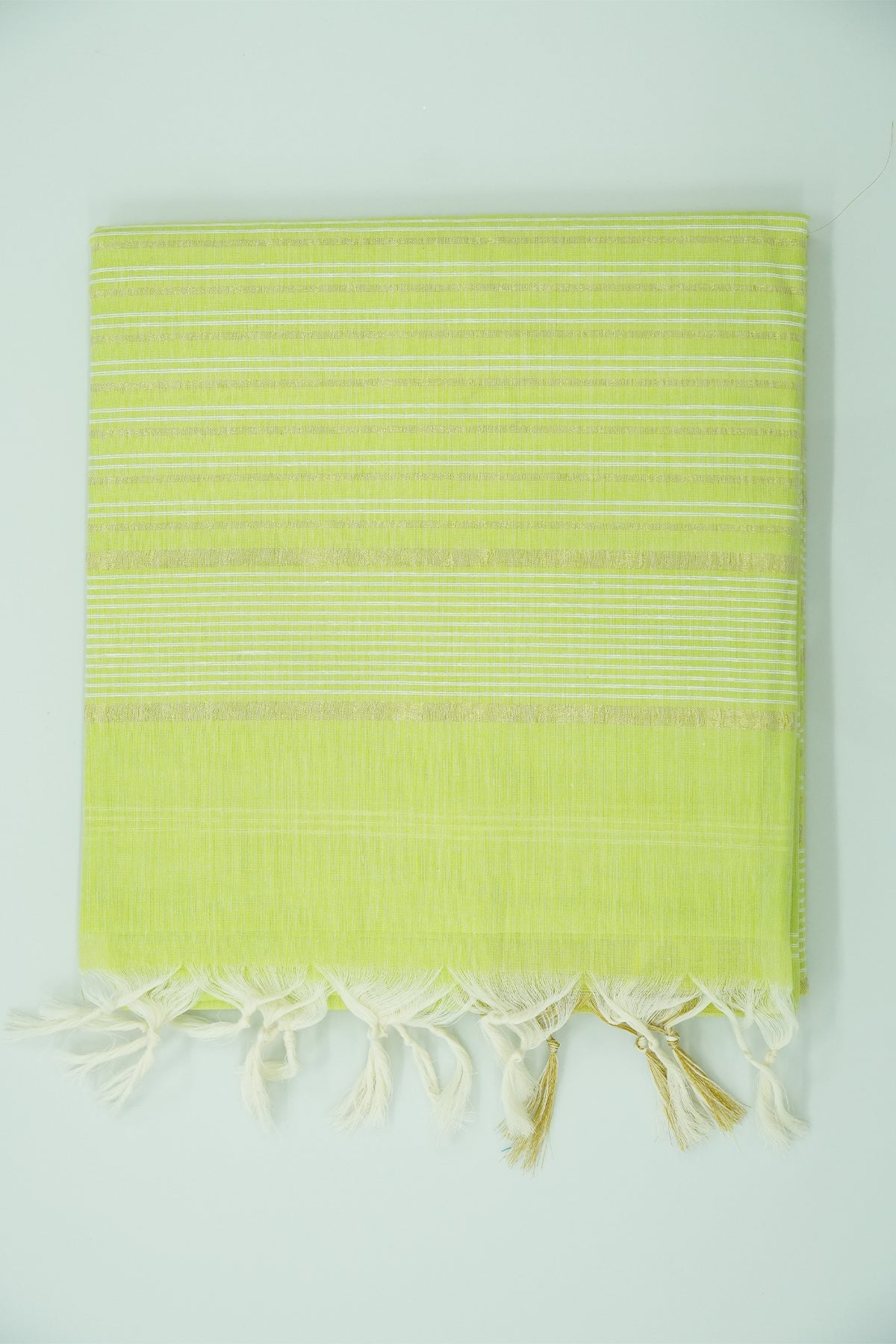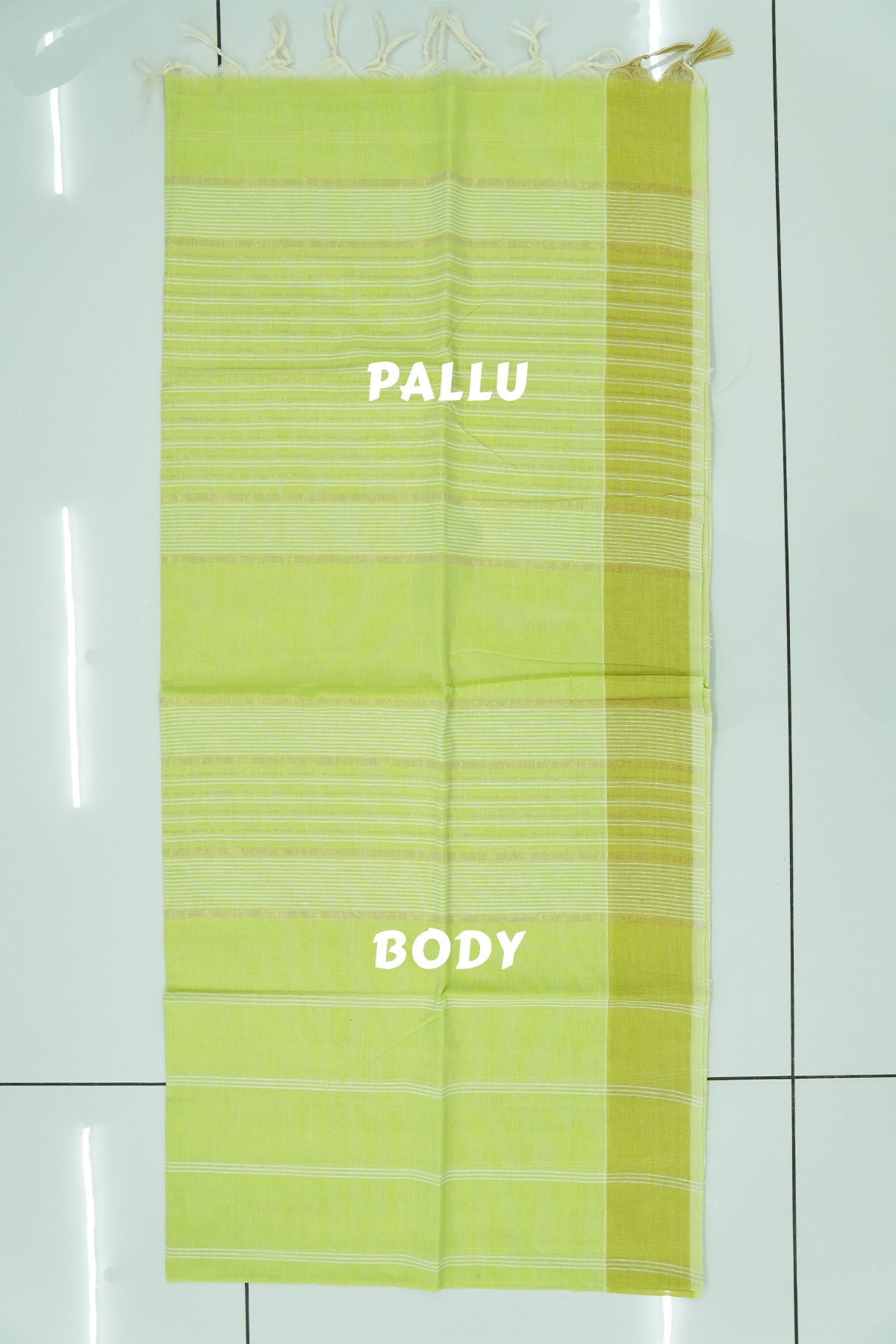 Introducing our elegant lime green cotton saree, designed with subtle golden zari line patterns that exude simplicity and charm. This saree is a perfect blend of tradition and comfort, making it ideal for daily wear and office use.