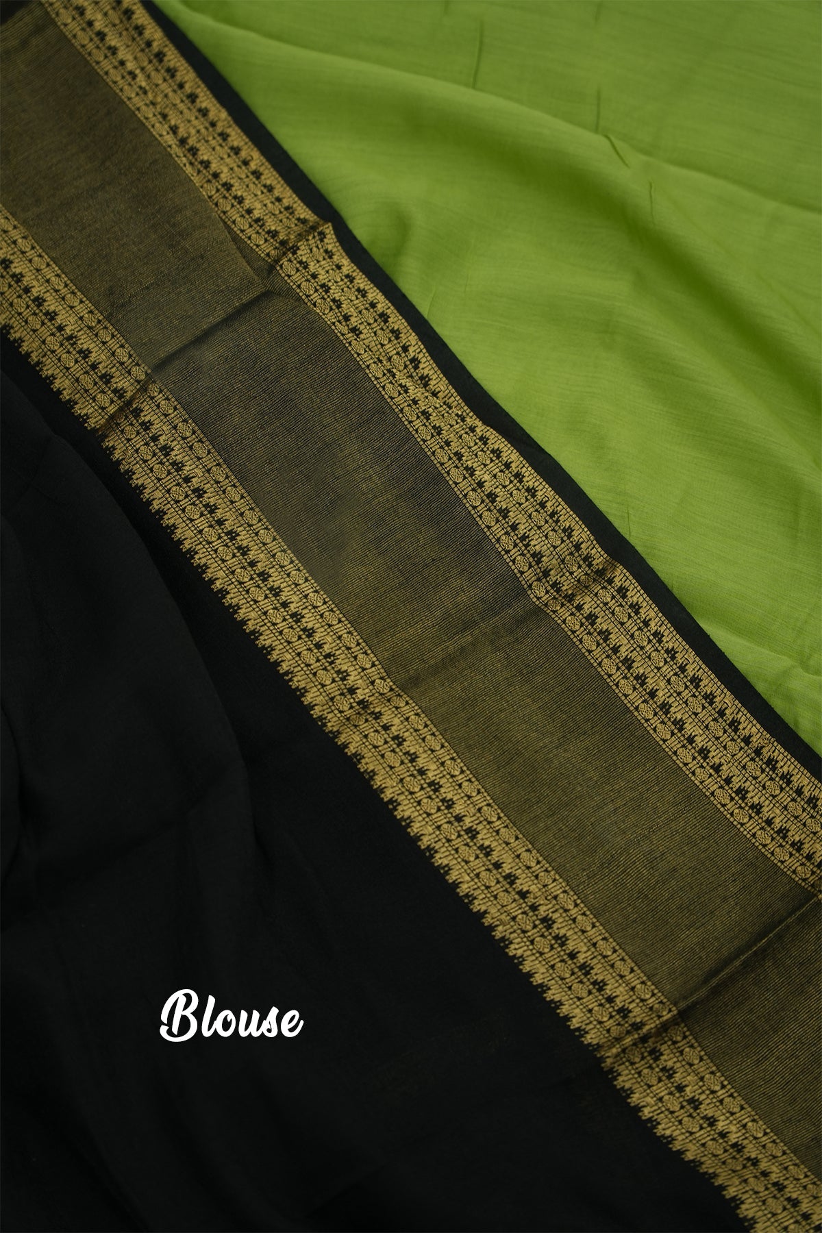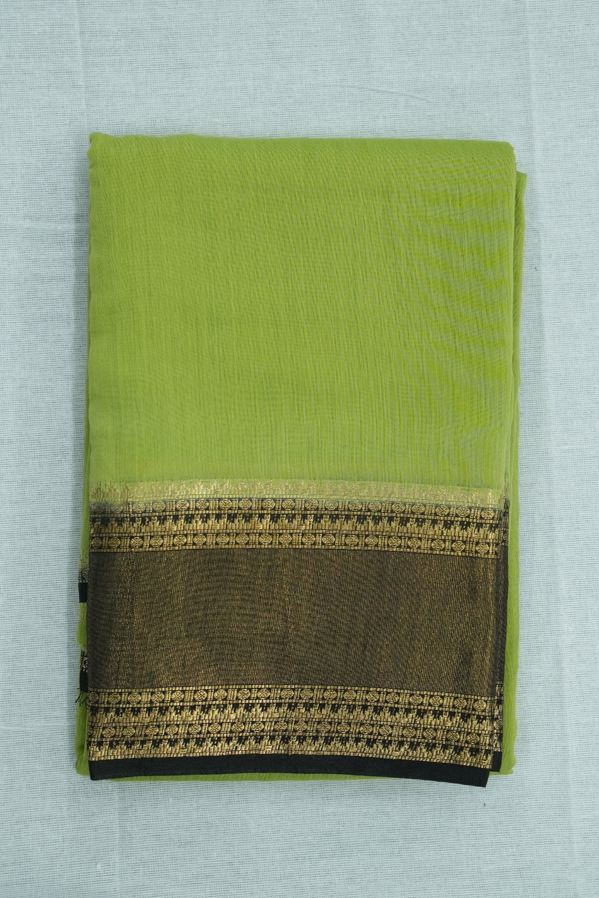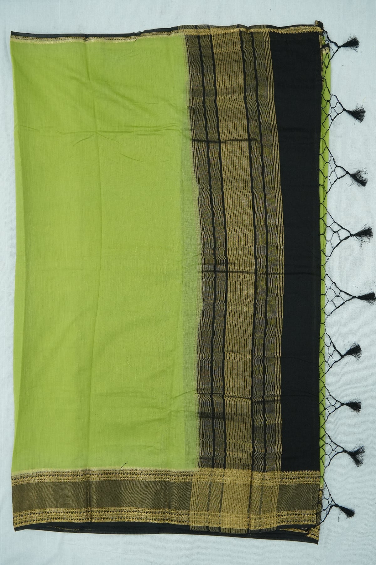 This elegant saree features a light green plain body paired with a black border with golden highlights, making it a versatile piece for both casual and festive wear.