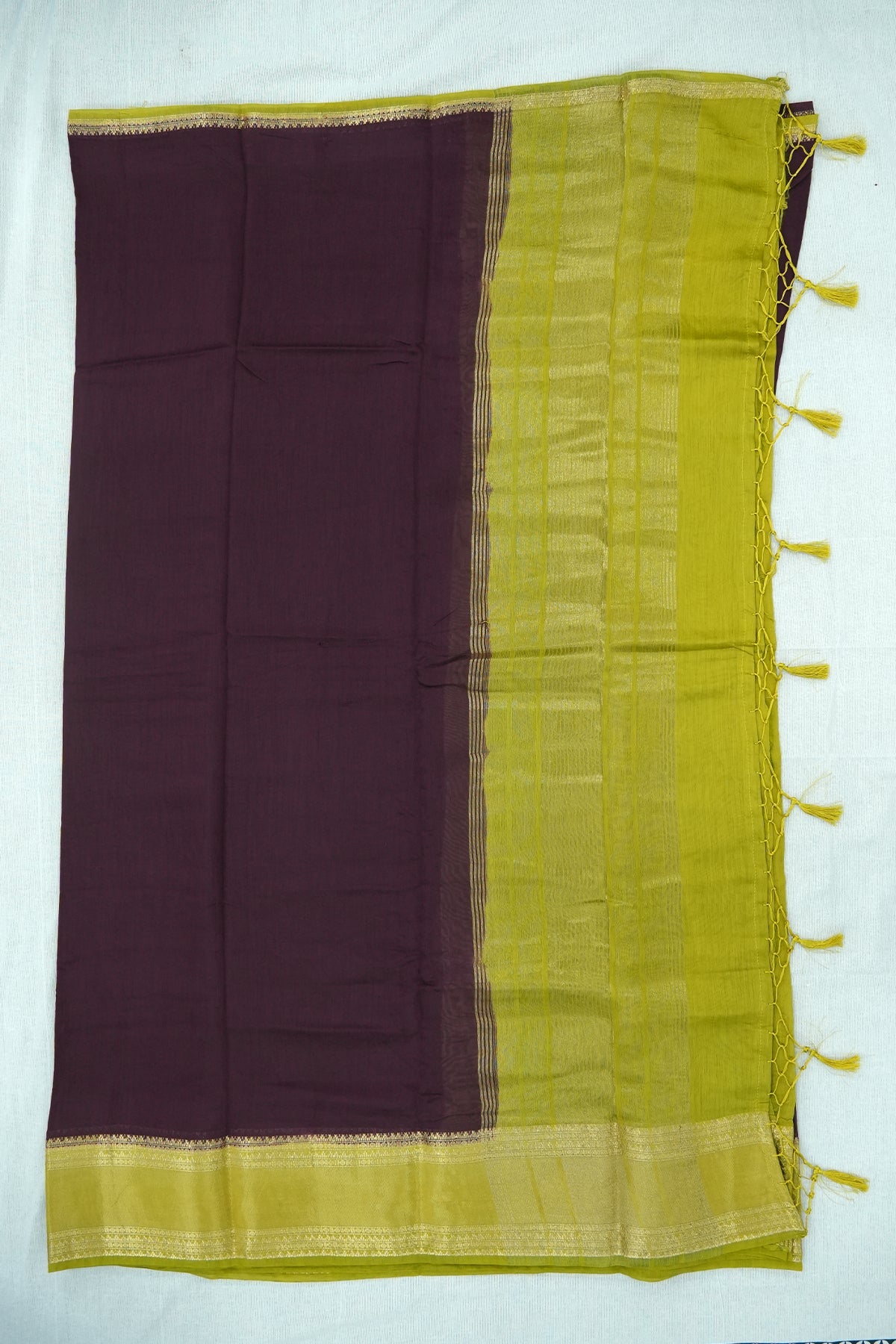 This purple Mal Mal Cotton saree with a contrasting yellow border highlighted in golden work carries a regal charm. A bold and festive choice for weddings, cultural events, and celebrations.