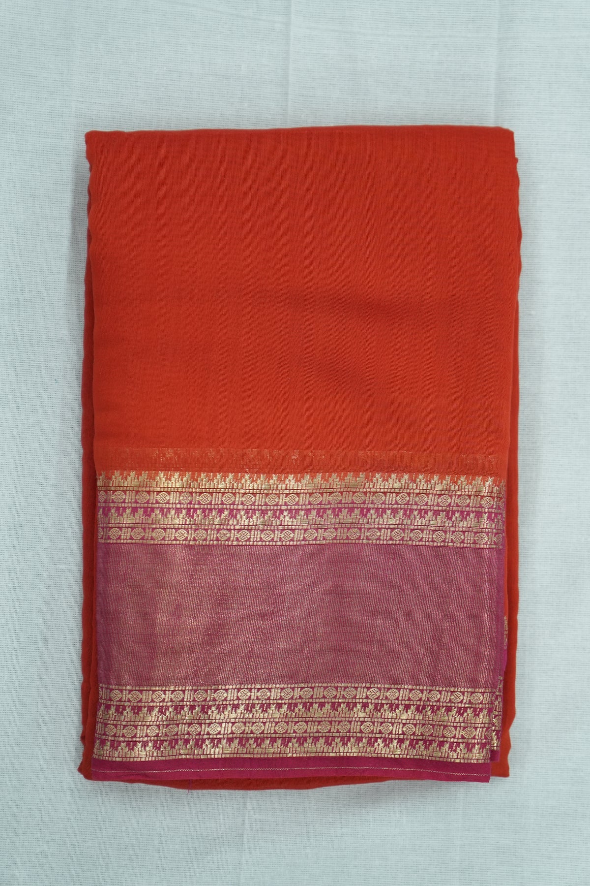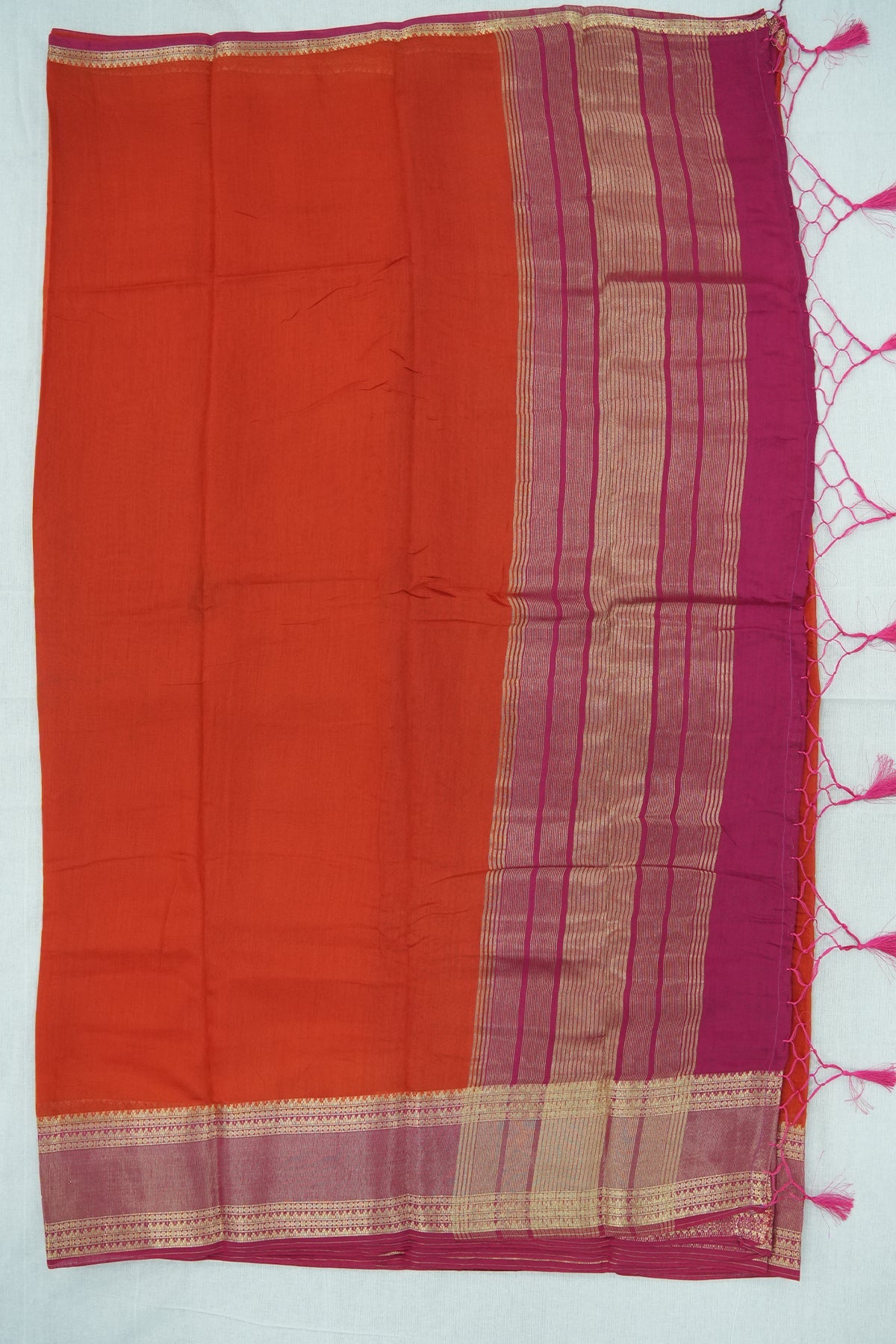 This saree glows with its reddish-orange body and rose border with golden detailing, giving it a festive and radiant appeal. An ideal pick for weddings and joyful occasions.