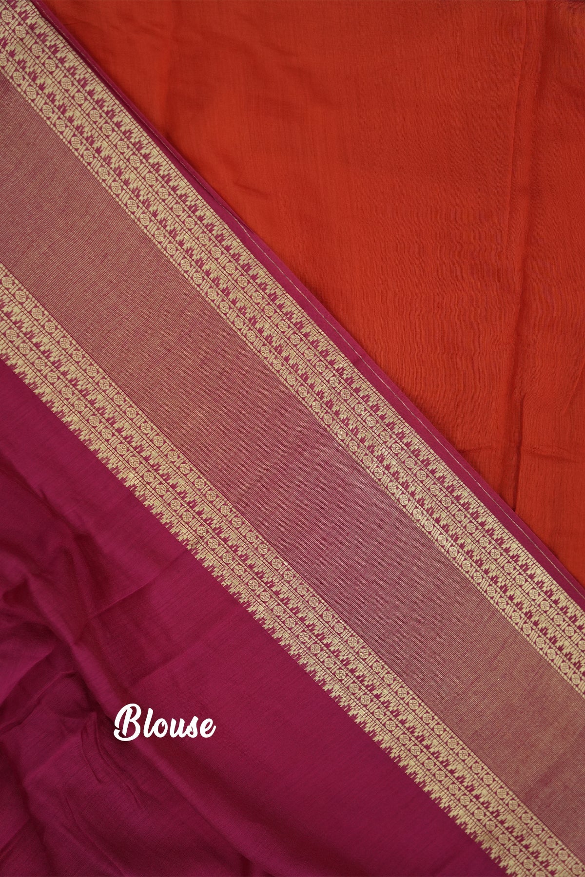 Mal Mal Cotton Saree – Reddish Orange Body with Rose Border & Golden Work