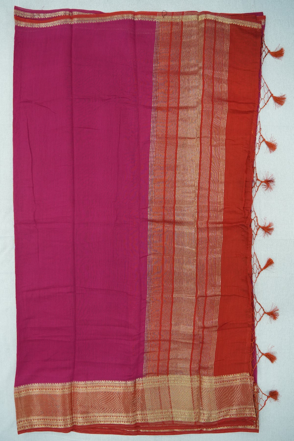 A beautiful rose-colored body paired with an Red border highlighted in golden work. This combination creates a warm and lively saree that’s perfect for celebrations and traditional gatherings.