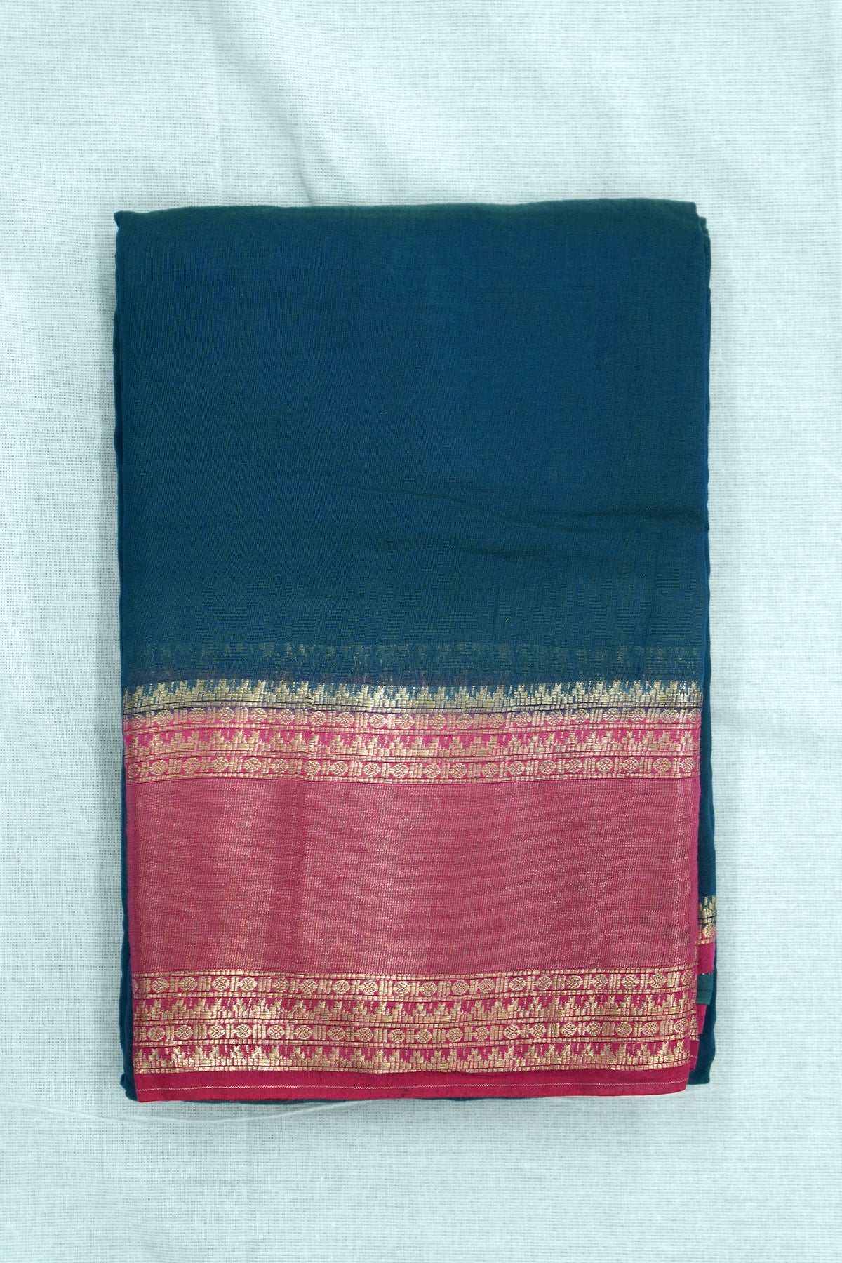 This Teal Blue Mal Mal Cotton saree is beautifully paired with a rose border enhanced with golden work. A refreshing and stylish saree that suits festive as well as casual occasions.