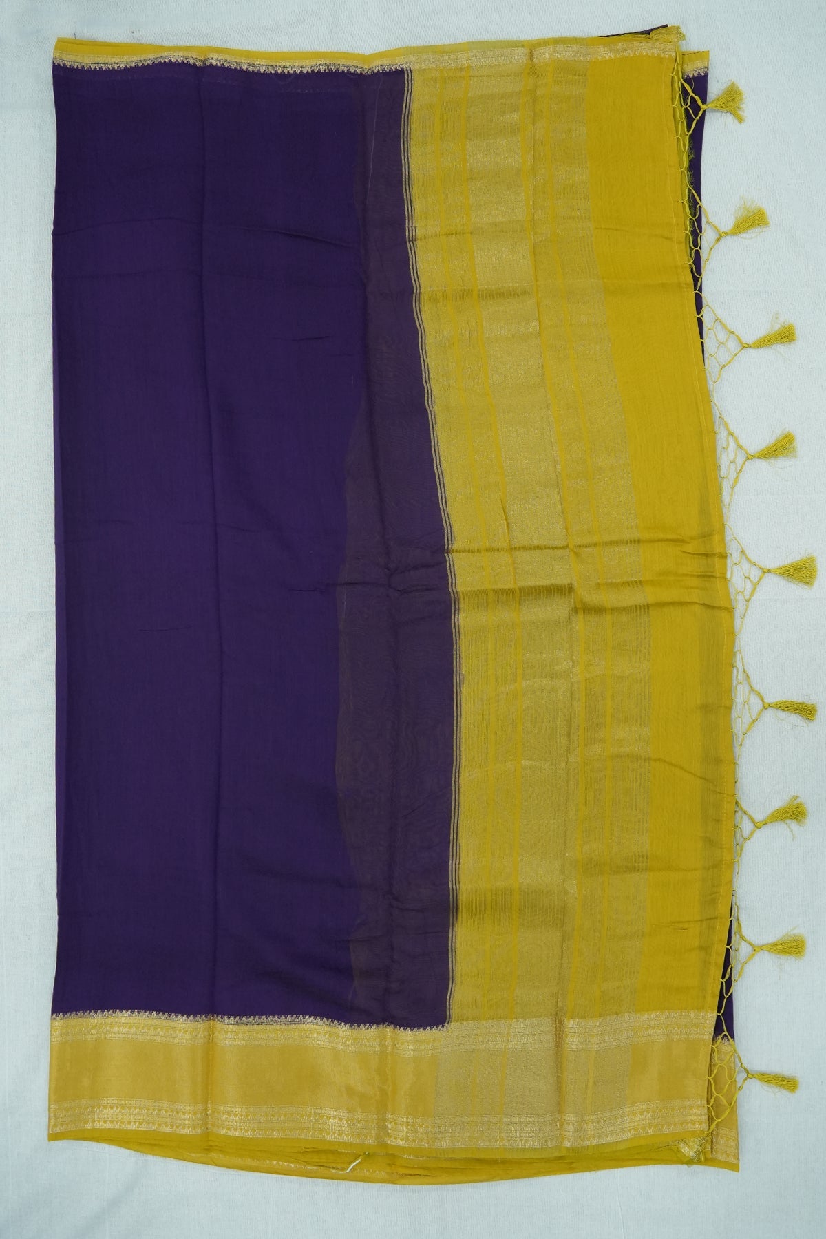 A royal violet body enhanced by a yellow border with golden accents. The bold contrast makes this saree stand out in any festive or traditional setting.