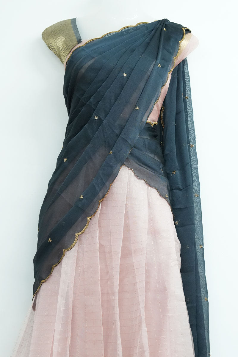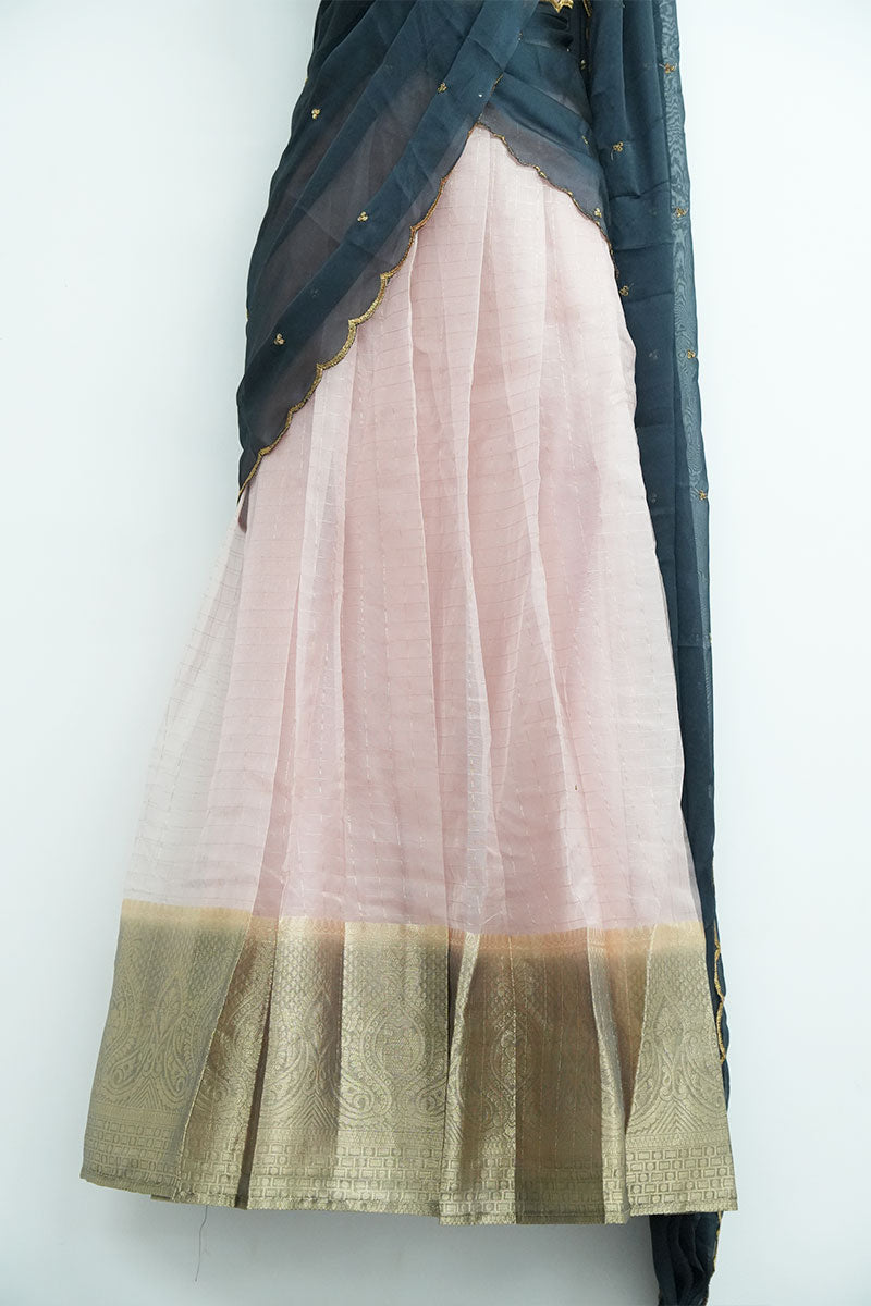 Organza Checks Dhavani Set, a stunning blend of soft pastels and bold contrasts. This graceful ensemble includes: