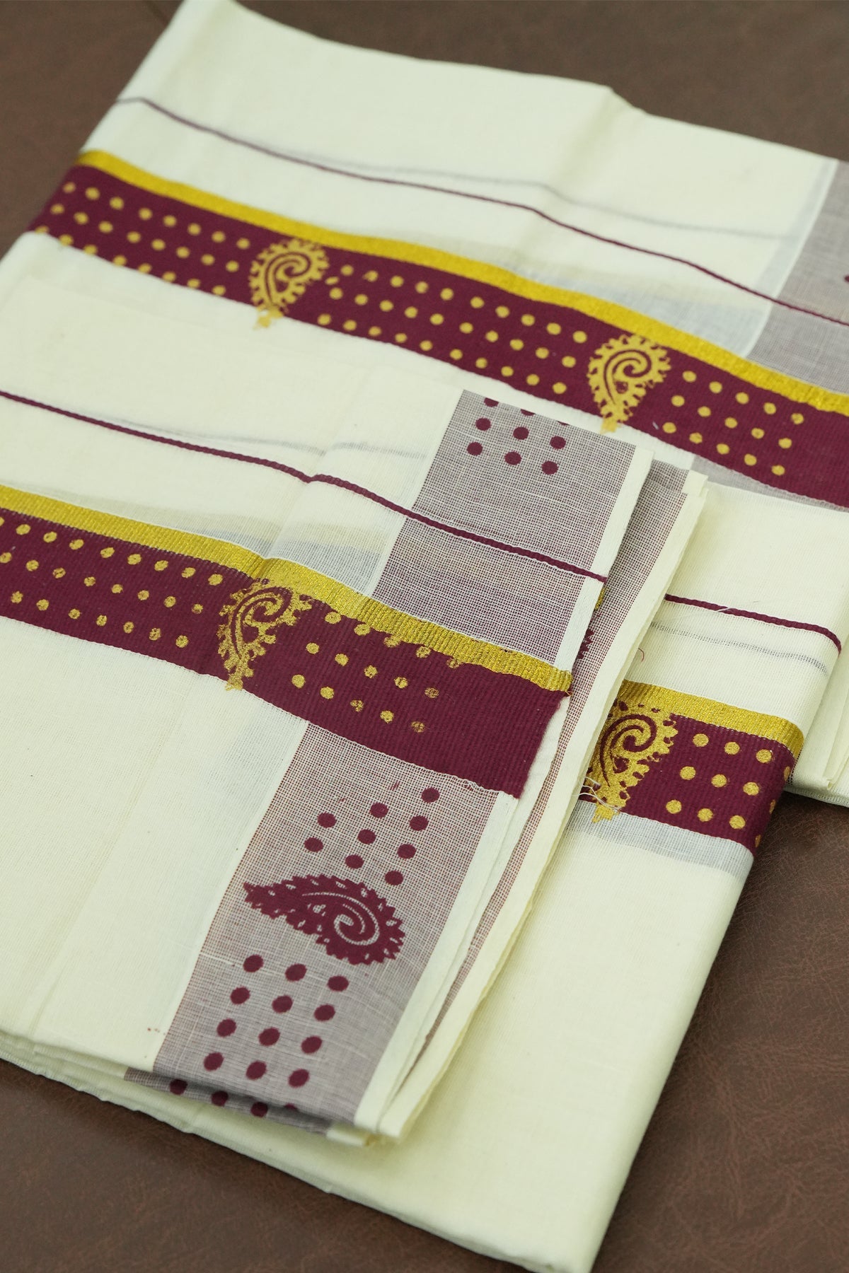 A blend of timeless tradition and rich color, this Maroon Cotton Set Mundu is elevated with golden kara and shimmering golden print work. The deep maroon tone adds depth and grandeur—perfect for elegant traditional occasions.