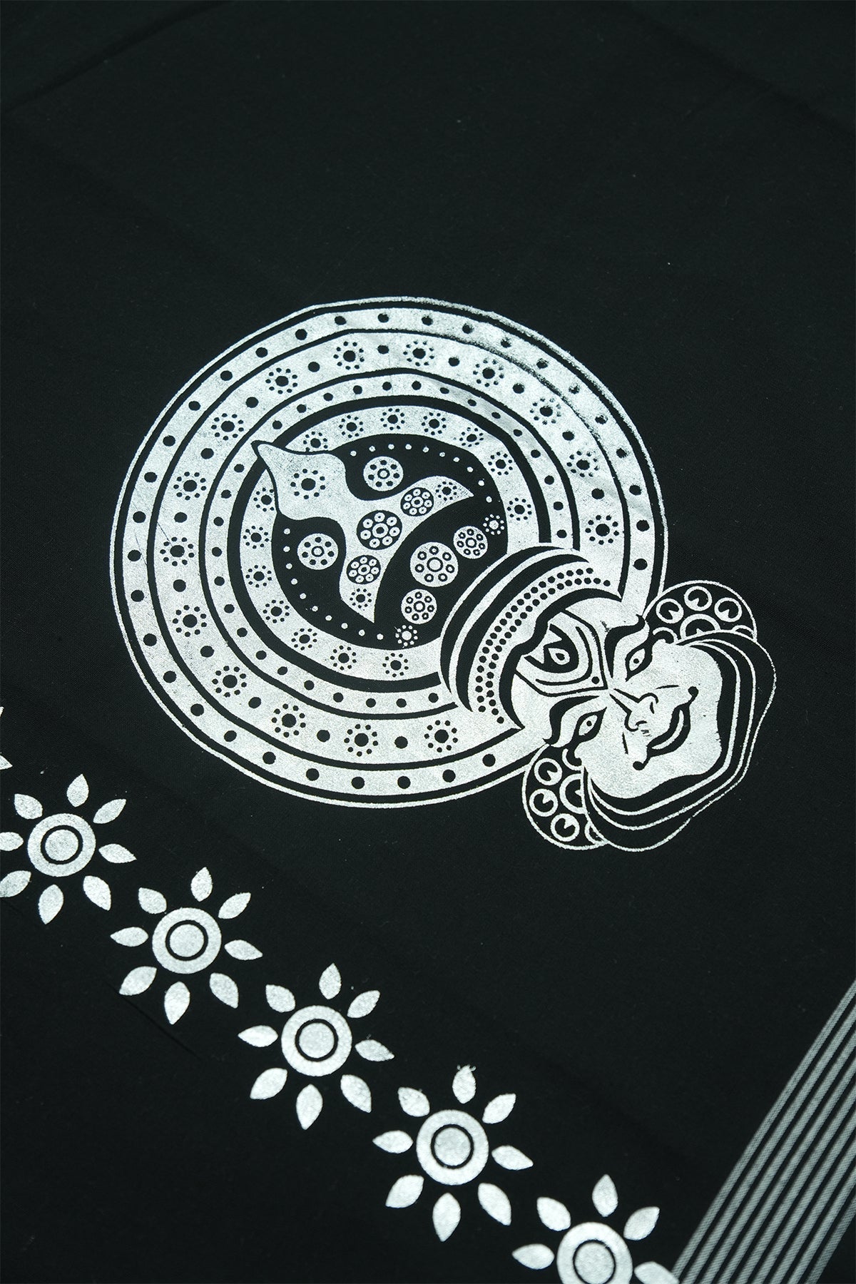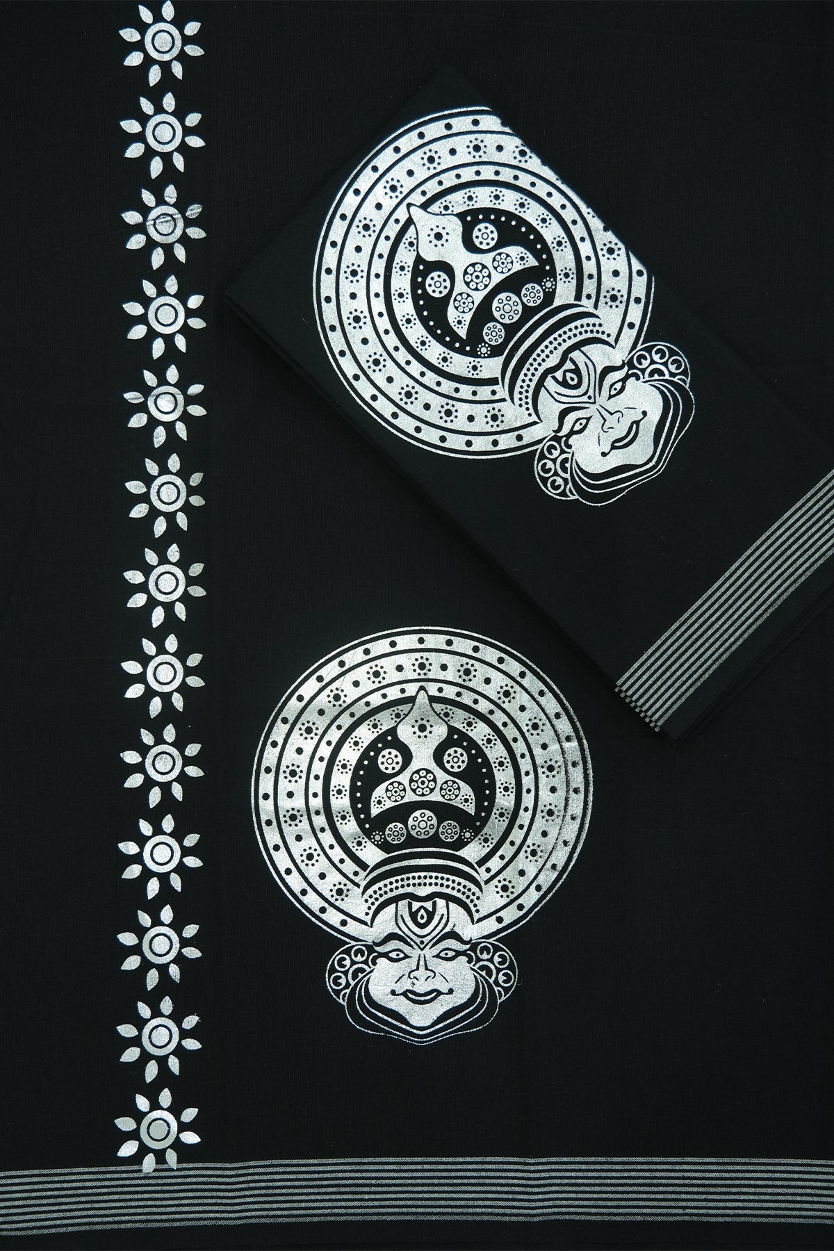 Adorn tradition with our Silver Kathakali Print Single Dhothi. The bold silver Kathakali motif celebrates Kerala’s classical dance heritage, accentuated with floral kara detailing. The striking black cotton base and rich yellow border make it a unique and cultural attire for festive occasions.