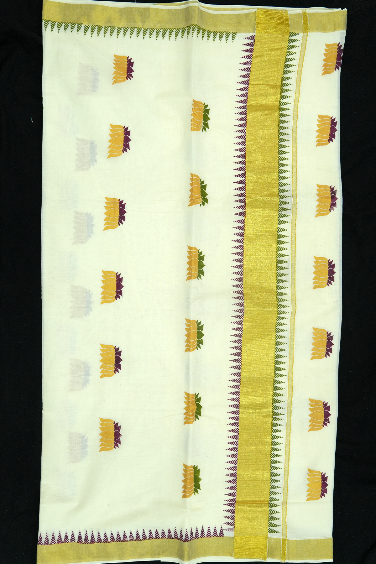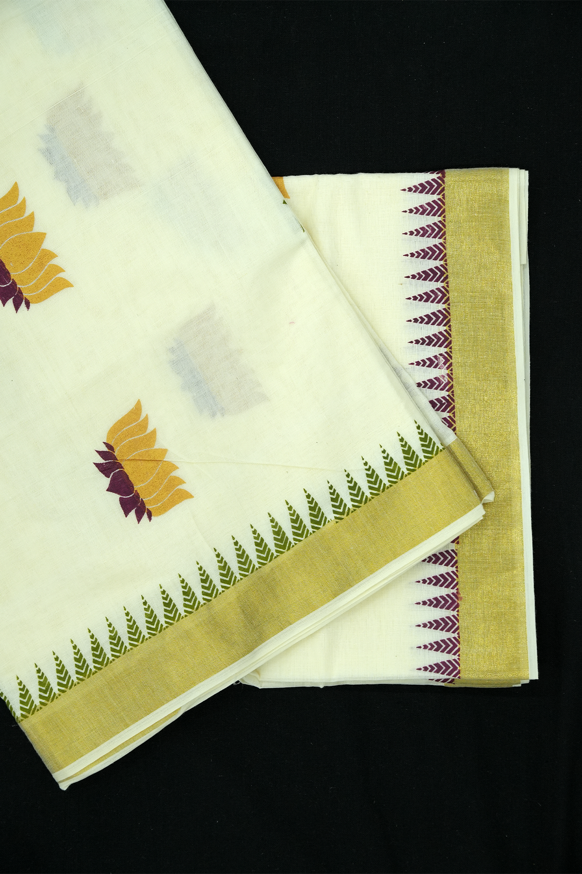 Lotus Print Set Saree – Golden Lotus Design with Temple Border (#0001)
