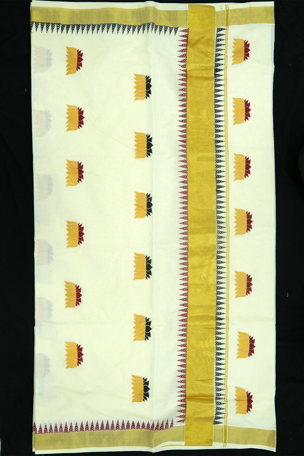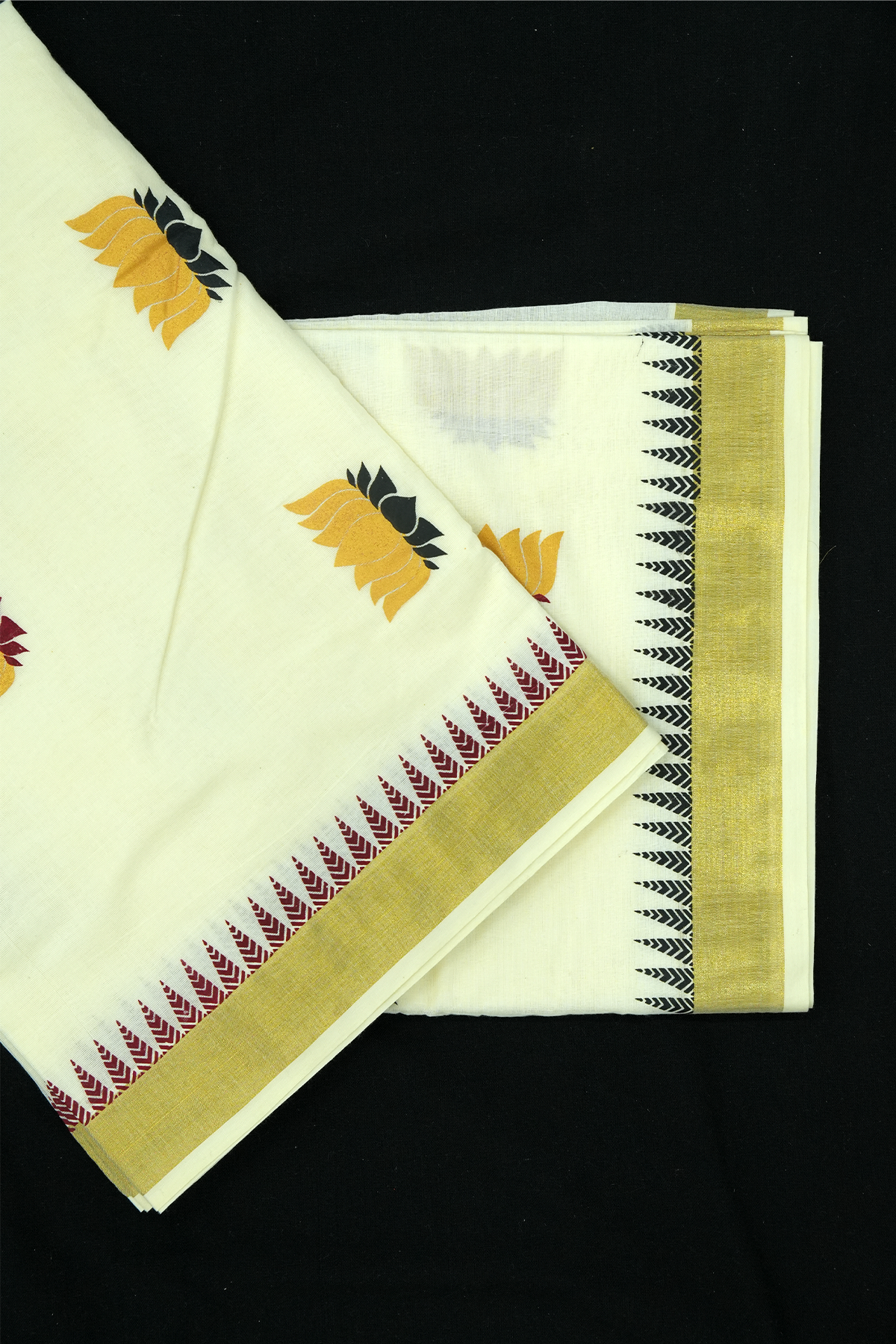 Grace meets tradition in our Lotus Print Set Saree Collection, featuring beautiful golden lotus petal motifs with dual-colored sepals that add a vibrant yet elegant touch. The saree is enhanced with a golden kara adorned by a two-color temple design, complemented by a matching border with colored temple motifs.