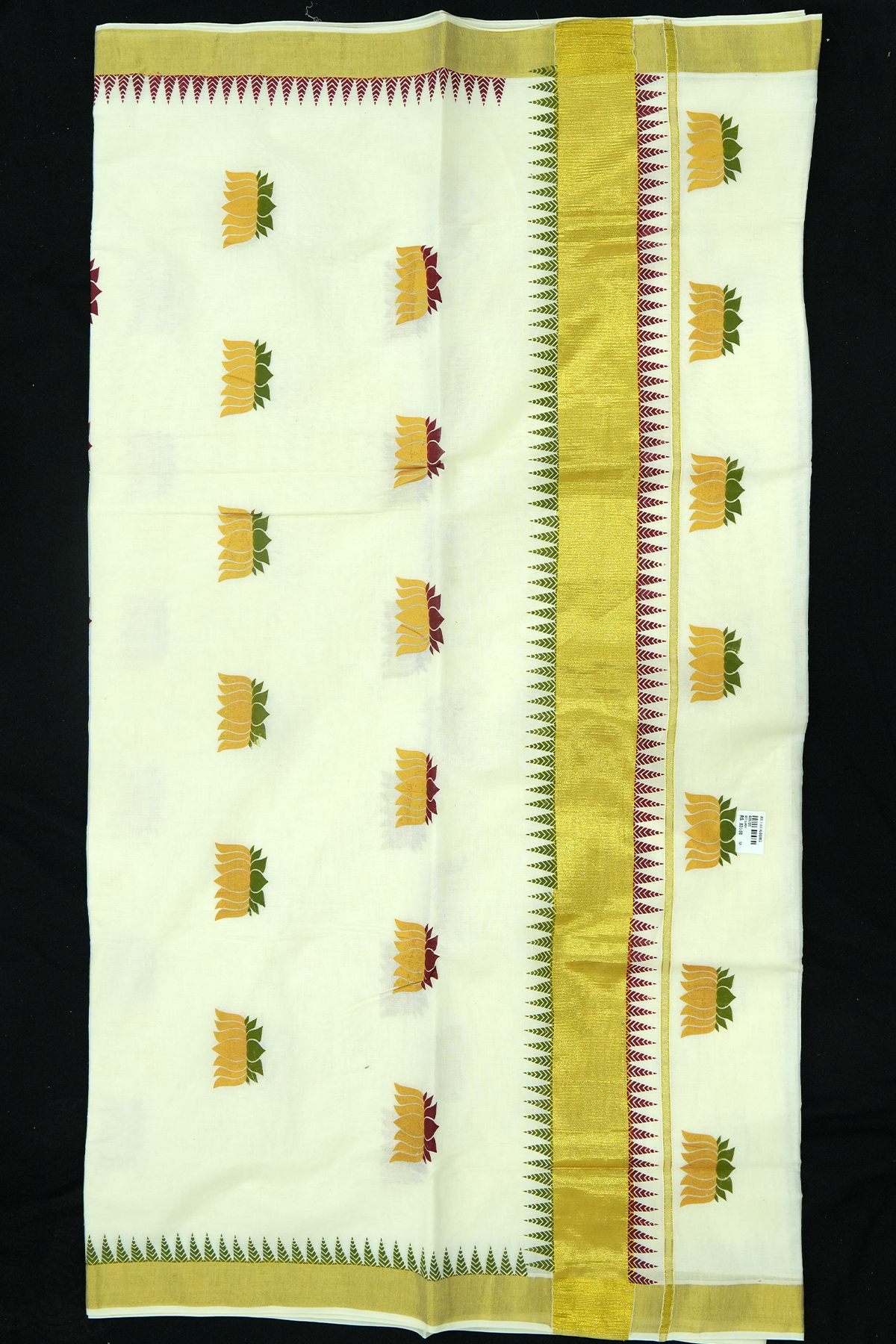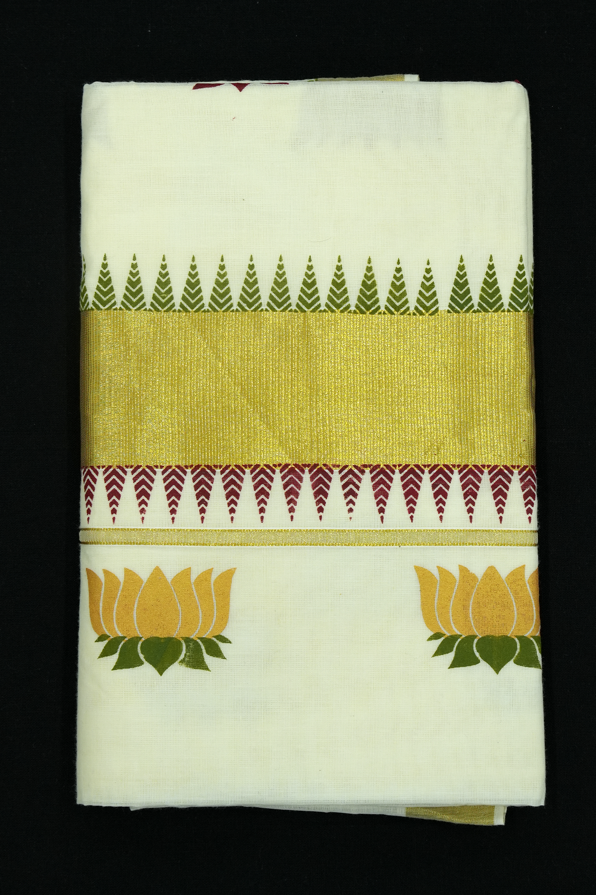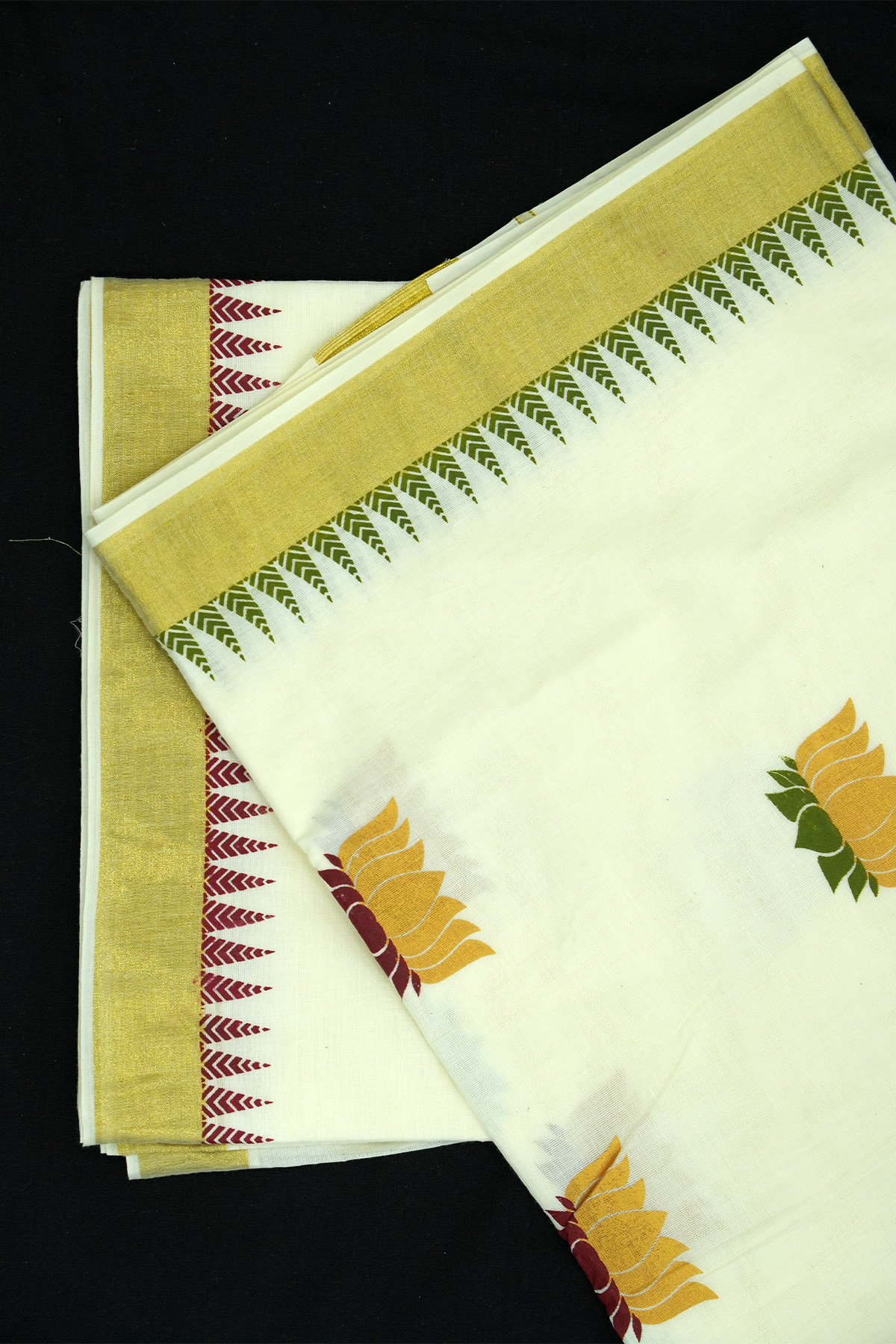 Lotus Print Set Saree – Golden Lotus Design with Temple Border (#0005)